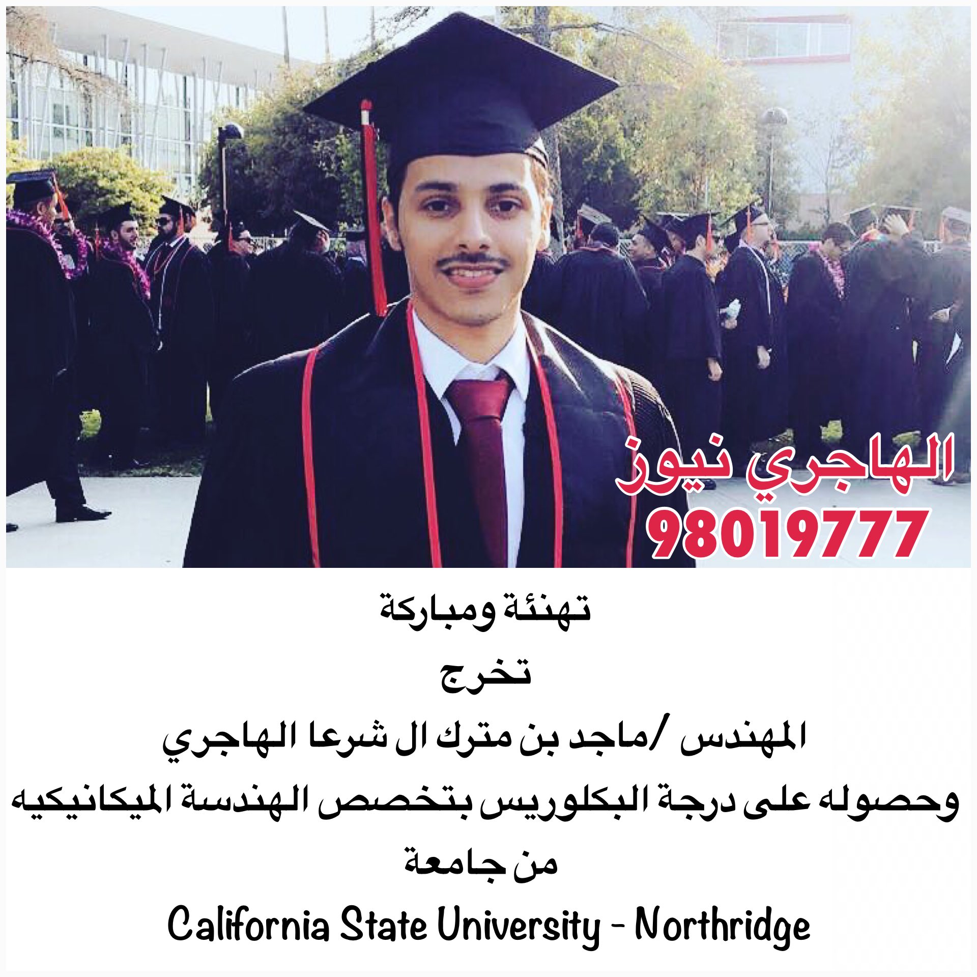 الـهـاجـري نـيـوز Twitterren تهنئة ومباركة تخرج المهندس فــهــد علي حمود المركوز وحصوله على بكالريوس الهندسة الميكانيكية مع مرتبة الشرف من جامعة كاليفورنيا نورث ردج الولايات المتحدة الامريكية Https T Co Lnyr2snexw